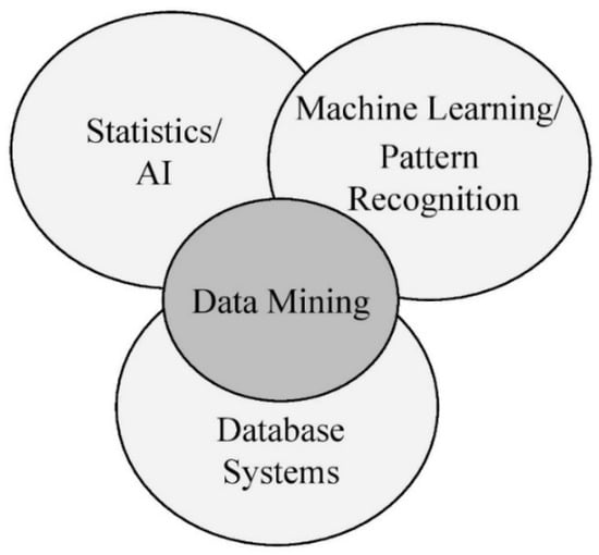 DM is the systematic process of exploring, analyzing, and extracting meaningful patterns or knowledge from data using computational and statistical methods. It plays a crucial role in various sectors, including business, healthcare, finance, marketing, and scientific research, by promoting data-driven decision-making and predictive modeling [,]. As a highly application-driven domain, DM has assimilated many techniques from other domains, including statistics, ML, pattern recognition, database systems, visualization, and various other application domains, as presented in Figure 3. Although the concepts of DM and ML are distinct, their fields are complementary, which contributes significantly to the success of DM and its applications [].