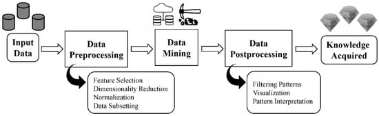 The DM process starts with the selection of target data from the raw material and proceeds with preprocessing and transforming it into an appropriate format. The workflow of a common DM application is presented in Figure 4 and typically comprises the following stages: (i) data preprocessing, (ii) use of DM tools, and (iii) data postprocessing. Various types of data are employed in data analysis, including database records, matrix data, documents, graphs, links, transaction data, DNA sequence data, whole-genome information, and spatiotemporal data [].
