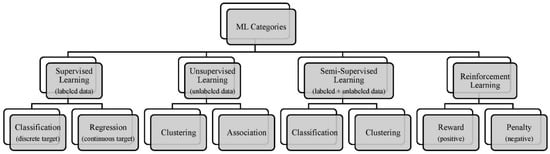 In general, ML methods can be divided into four major categories, supervised, unsupervised, semi-supervised, and reinforcement learning, as shown in Figure 5. The effectiveness and the efficiency of an ML technique are dependent on the inherent attributes of the data and the capabilities of the learning algorithms. Selecting an appropriate learning algorithm suitable to a specific domain is a challenging task, since various learning algorithms have different purposes, and even within the same category, the outcomes can differ based on the data features. Therefore, it is important to understand the principles of different ML algorithms and their suitability for several real-world applications [].