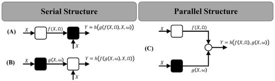 Current knowledge gaps include the integration of heterogeneous data types, limited use of advanced learning strategies, and the absence of standardized benchmark datasets. To address such issues, hybrid modeling (HM) offers a promising approach that combines existing domain knowledge with ML techniques, thus providing a better modeling strategy []. Typically, HM integrates white-box models, which encode prior process knowledge, with black-box models such as ANN or SVM, within a single framework, where each component performs a specific role [,].