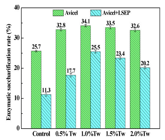 Generally, hydrophobic interaction plays a critical role in the non-productive adsorption of cellulase on lignin. As depicted in Table 3, the hydrophobicity value of the LSEP+Tween 80 group (0.25 L/g) was 24.9% lower than the value for LSEP (0.33 L/g), which aligned with the result of the cellulase adsorption rate, suggesting that Tween 80 reduced the hydrophobic interaction between LSEP and RB (p < 0.05). It has been reported that the irreversible adsorption of hydrophobic olefin chains (C18) onto lignin is primarily caused by dispersion interactions, resulting in the solubilizing of lignin molecules. This is achieved by making the lignin surfaces more hydrophilic via increasing their polar surface energy component, which adversely reduces both the extent of cellulase adsorption and the rate of subsequent gradual mass increase [43,44].