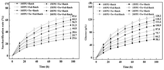 As depicted in Figure 3, under the condition of 10 FPU/g glucan of cellulase cocktail loading, the ESR for batch and fed-batch ESHSL of SEP was 36.1% (corresponding to glucose: 39.2 g/L) and 38.9% (corresponding to glucose: 42.3 g/L), respectively. With the addition of Tween 80, the ESR increased to 43.5% (corresponding to glucose: 48.6 g/L) and 48.1% (corresponding to glucose: 57.3 g/L), representing a 20.5% and 23.6% increase compared to the one without Tween 80, respectively. With increase in cellulase loading from 10 FPU/g glucan to 20 FPU/g glucan, the ESR of batch ESHSL increased from 43.5% to 78.9% (corresponding to glucose: 85.7 g/L), representing a 20.5–118.6% increase compared to the control (36.1%) under the condition of 10 FPU/g glucan cellulase loading without Tween 80. Similarly, under the condition of cellulase loading from 10 FPU/g glucan to 20 FPU/g glucan, the ESR of fed-batch ESHSL increased from 48.1% to 86.4% (corresponding to glucose: 93.9 g/L), representing a 23.6–122.1% increase compared to the control (38.9%) under the condition of 10 FPU/g glucan cellulase loading without Tween 80. Furthermore, the ESRs and glucose yields obtained in fed-batch ESHSL were also higher than those in batch ESHSL (p < 0.05). Moreover, the fed-batch ESHSL strategy enhanced by Tween 80 proved more effective for steam-exploded poplar than other recent approaches, as summarized in Table 1.