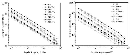 Effect of Tween 80 on complex viscosity of ESHSL slurry ((A) Batch; (B) Fed-batch).