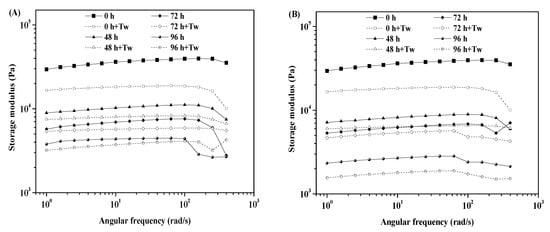 Effect of Tween 80 on storage modulus of ESHSL slurry ((A) Batch; (B) Fed-batch).