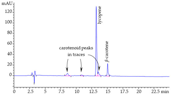 The total extract was analyzed by HPLC-DAD to characterize the extracted carotenoids. The respective chromatogram, monitored at 450 nm is presented in Figure 2. Two basic components and three additional trace peaks were detected, each one bearing the spectral characteristics of carotenoids. Peaks with a retention time (r.t.) of 13.21 min, and 15.05 min matched both the spectra, as well as the retention times of lycopene and β-carotene, respectively. For confirmation, solutions of the standard compounds were spiked in the extract, and further HPLC analysis revealed the increase of the two peaks.