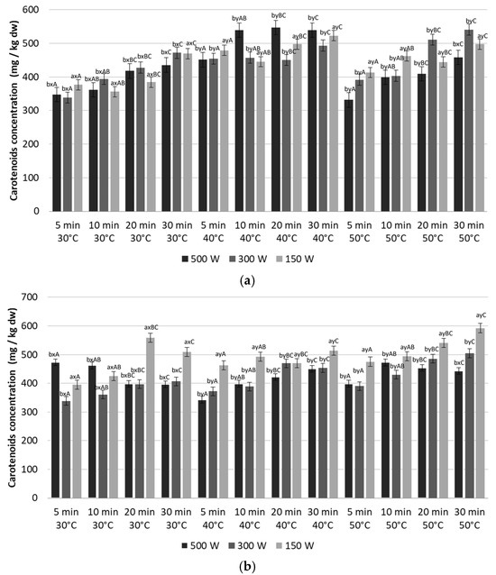 Effect of microwave power, extraction time, and temperature of MAE on total carotenoid yield (as spectrophotometrically determined), using a solid/liquid ratio of (a) 1:10 g/mL, and (b) 1:30 g/mL. Superscript letters a, b represent significant differences (p < 0.05) between extraction Watt. Superscript letters x, y represent significant differences (p < 0.05) between extraction temperature. Superscript letters A, B, C represent significant differences (p < 0.05) between extraction time (n = 4).