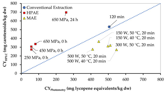 Correlation of the results from photometric determinations (total carotenoids expressed as lycopene equivalents) vs. HPLC-DAD analyses, concerning the extracts obtained by conventional extraction, MAE for 20 min/solid-to-liquid ratio 1:10, and HPAE with a solid-to-liquid ratio 1:10.