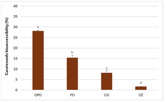 Bioaccessibility (%) of total carotenoids expressed as lycopene equivalents in edible oils (olive pomace oil (OPO), fish oil (FO), and corn oil (CO)), compared to the pure extract obtained via conventional extraction (CE). Superscript letters represent significant differences (p < 0.05) between the samples. Data are described as mean value ± standard deviation (n = 3).