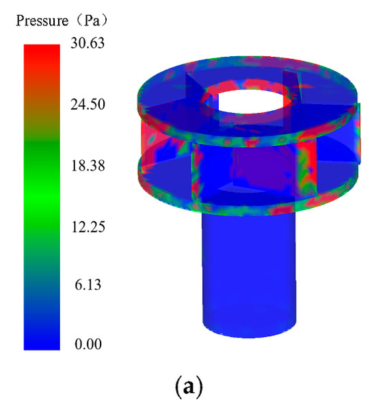 To further clarify the wear locations of each component, the EDEM post-processing module was used to analyze the pressure on each component during the simulation. The obtained wear-prone patterns for each component are as follows: (1) Wear on the particle accelerating rotor is the most widespread, ranging from the feed inlet on the rotor’s top plate to the flow channel of the guide plates and to the outer side of the accelerating rotor, showing relatively severe wear. (2) Severe pressure on the impact rotor is mainly concentrated on the impact plates. (3) Pressure on the anvil plate is mainly randomly distributed across the entire tooth surface. (4) Due to the anvil plate shielding the main force on its inner wall, pressure on the crushing system’s housing is mainly concentrated around the discharge port at the lower part of the housing. The pressure conditions on each component are shown in Figure 12. Wear-prone locations can be strengthened by methods such as spraying wear-resistant coatings or heat treatment to improve service life.