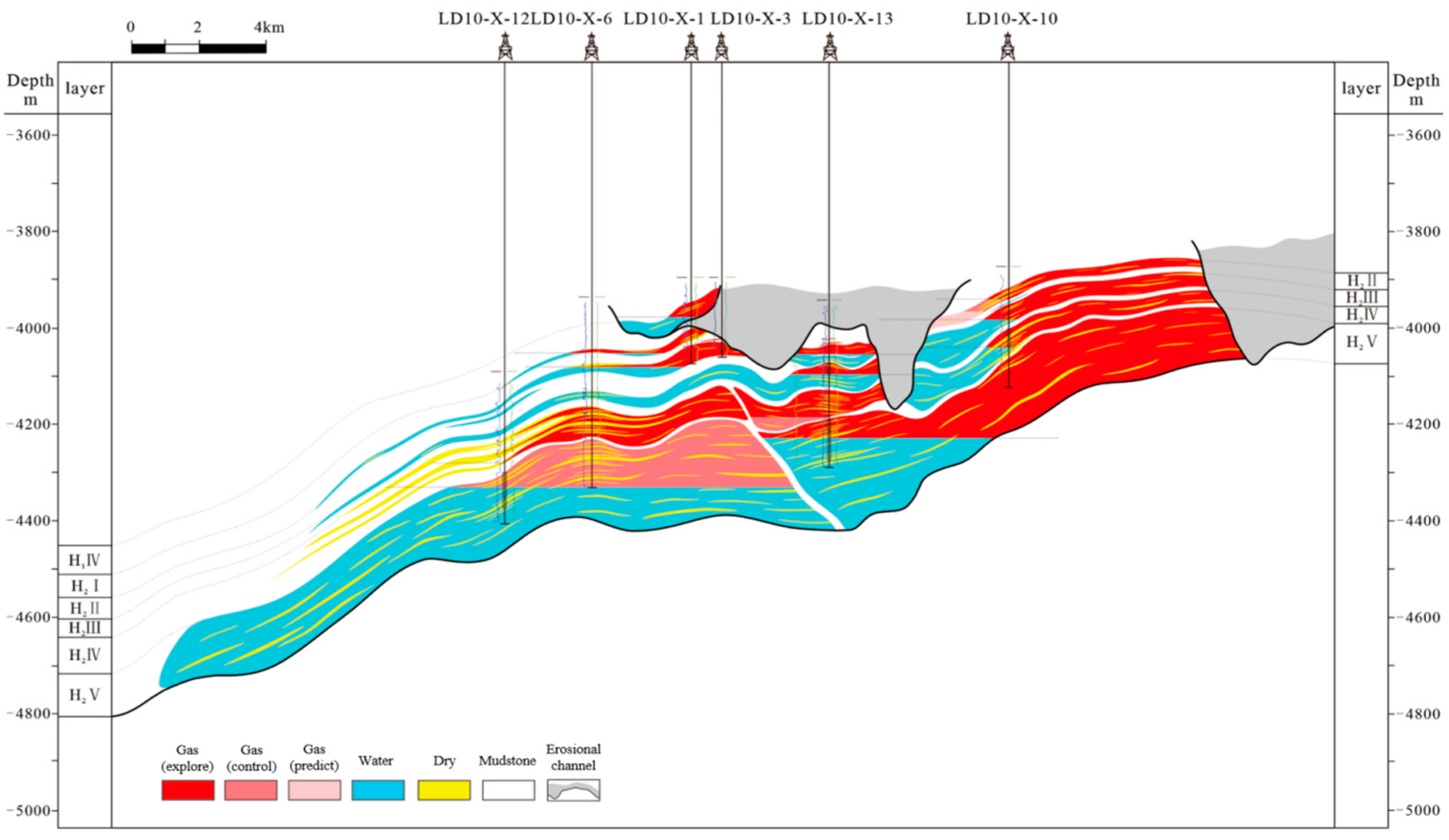 - Fan, C.; Cao, J.; Luo, J.; Li, S.; Wu, S.; Dai, L.; Hou, J.; Mao, Q. Heterogeneity and influencing factors of marine gravity flow tight sandstone under abnormally high pressure: A case study from the Miocene Huangliu formation reservoirs in LD10 area, Yinggehai Basin, South China Sea. Pet. Explor. Dev. 2021, 48, 1048–1062. [Google Scholar] [CrossRef]