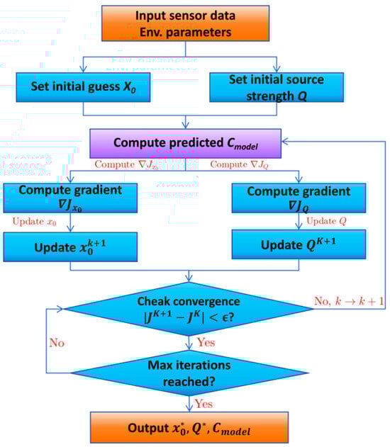where ϵ is typically set to 10−6, indicating that the variation in the objective function J(x0,Q) becomes negligible. At convergence, the optimal leakage source location x0∗ and source strength Q∗ are obtained, corresponding to the state where the model-predicted concentrations Cmodel best match the measured concentrations Ci. These converged parameters x0∗ and Q∗ represent the most physically realistic estimates of the leakage source characteristics.