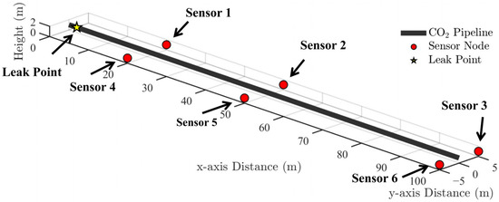 Six wireless concentration sensors were arranged along both sides of the pipeline in the downwind direction, with their height aligned to the pipeline centerline (z = 1 m). The sensor positions form a 2 × 3 rectangular grid, and the specific coordinates are provided in Table 1. After initiating the simulated leak, CO2 concentrations at each monitoring point were recorded in real time. These data were subsequently used in conjunction with the proposed inversion model and algorithm to estimate the leak source location and mass flow rate. A schematic illustration of the sensor layout is shown in Figure 3.