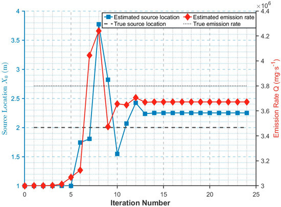 The optimization involved 24 iterations. During the initial iterations, larger step sizes caused significant adjustments in the estimated values of x0 and Q. As the iteration progressed, the step size gradually decreased, and the predicted source location and release rate converged. After the 24th iteration, both x0 and Q stabilized, with step sizes falling below 10−6, approaching zero, indicating that the optimization process had fully converged.