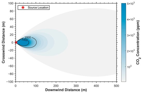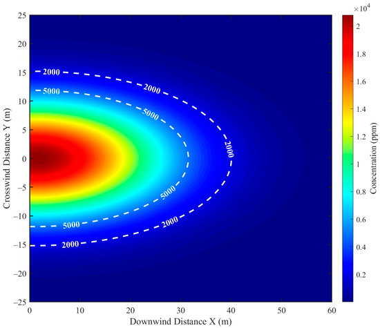 Based on the simulated CO2 concentration data on both sides of the pipeline 30 min after the leakage, the concentration distribution at a height of 1 m is presented in Figure 5. The results show a characteristic fan-shaped dispersion pattern, with contour lines delineating the edges of the plume. Near the leakage point (at x = 2 m), the CO2 concentration reaches its peak, exceeding 1.5 × 105 ppm. Along the downwind direction, the concentration gradually decreases; however, even at the far end of the pipeline (x = 100 m), the concentration remains above 2000 ppm, which may cause discomfort such as shortness of breath and headaches [27]. Influenced by the lateral diffusion coefficient σy, the horizontal spread in the y-direction is relatively limited, although the dispersion range gradually expands with increasing the downwind distance. This figure demonstrates the capability of the Gaussian plume model to predict the concentration distribution of gas leaks under wind conditions, and it captures the characteristic attenuation of gas concentration with distance in realistic leakage scenarios.