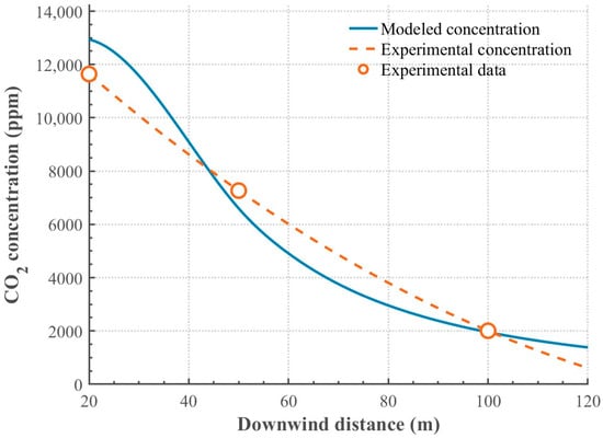 To further assess the predictive performance of the model, a CO2 concentration profile along the pipeline at y = 5 m was generated from the model predictions. Correspondingly, a concentration profile was fitted based on the six simulated sensor measurements, as shown in Figure 6. It can be observed that the predicted values exceed the simulated measurements in the 20–42 m and 100–120 m sections, whereas they are lower than the measurements in the 42–100 m section. Overall, the magnitude of the errors satisfies engineering accuracy requirements, and the predicted concentrations show good agreement with the simulation data, demonstrating the validity of the proposed model.