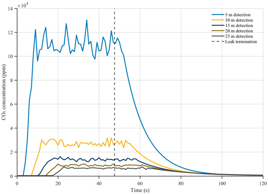 The sensor located 5 m from the leak responded first, reaching a peak concentration of 130,296.7 ppm at 21.8 s. With increasing the downwind distance, the peak occurrence was progressively delayed to 10 m (27.4 s), 15 m (32.6 s), 20 m (36.8 s), and 25 m (42.2 s), while the corresponding peak concentration decreased to 7801.0 ppm, exhibiting an exponential decay consistent with atmospheric dilution and dispersion characteristics. After the leakage ceased at 47.6 s, the CO2 concentrations at all monitoring points rapidly declined and returned to the ambient level (~400 ppm) at approximately 60 s.