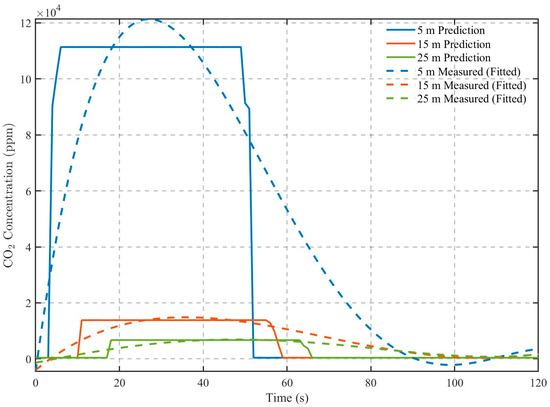 To evaluate the practical applicability of the proposed Gaussian plume inversion model, three representative monitoring points were selected at near-field (5 m), mid-field (15 m), and far-field (25 m) locations, corresponding to high-concentration, transition, and dilution zones, respectively, to comprehensively capture the spatial evolution of CO2 concentrations during the leakage process. Temporal comparisons at the representative points are shown in Figure 10. The model results indicate that, in terms of concentration distribution, the near-field (5 m) predicted value deviates from the measured value by approximately 8.96%. Since the model does not account for complex factors such as terrain, topography, or obstacles, the predicted peak concentration occurs earlier, reaching its maximum at 6 s, whereas the measured peak occurs roughly 20.9 s later, at approximately 26.9 s. This suggests that the model can capture the temporal evolution of concentration changes, providing valuable information for risk assessment and emergency response, thus demonstrating its potential practical value for safety applications.