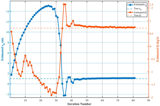 The Gaussian plume dispersion model was employed to calculate the CO2 concentration around the pipeline 30 min after the leakage, aiming to inversely estimate the leakage source location and release rate. A gradient descent numerical optimization algorithm was applied to iteratively solve for the source location x0 and the leakage rate Q, with the iterative process illustrated in Figure 4. The final optimized results were x0 ≈ 2.2507 m and Q ≈ 3671759.2181 mg/s, indicating that the leakage point is located 2.2507 m from one end of the pipeline, with a mass flow rate of approximately 3.67 kg/s.