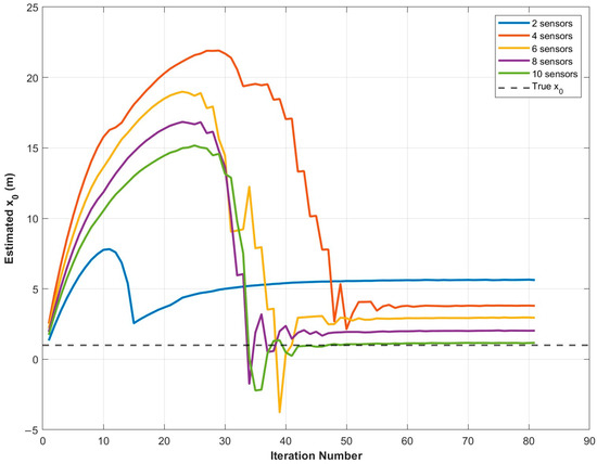 Figure 13 and Figure 14 illustrate the iterative inversion processes of the leak emission rate and source location, respectively, for varying sensor numbers. It can be observed that, as the number of sensors increases, the final inversion results for both emission rate and source location progressively approach the true values, demonstrating a clear improvement in convergence performance.