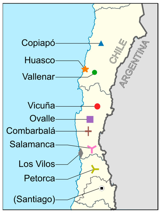 Nine cities of northern Chile are selected according to their water scarcity level (Köppen classification): Copiapó (BWk), Huasco (BWh), Vallenar (BWk), Vicuña (BSk), Ovalle (BSh), Combarbalá (BWh), Salamanca (BSh), Los Vilos (BSk), and Petorca (BSh). The climate conditions considered are the dry bulb temperature (T), the relative humidity (RH), and atmospheric pressure (P), which are extracted from the Meteonorm Software (version 7.0) using a time-step of 1 h [28] and considering a typical meteorological year. Figure 1 shows a map of the selected cities with the addition of the location of the Chilean capital (Santiago) for reference. The climatic variations between the selected cities are a result of the combination of latitude (transition from the world’s driest desert to steppe and Mediterranean climates), topography (the Andes Mountains and the Coastal Range), sea relative altitude, and the influence of the Humboldt Current.