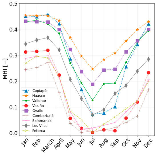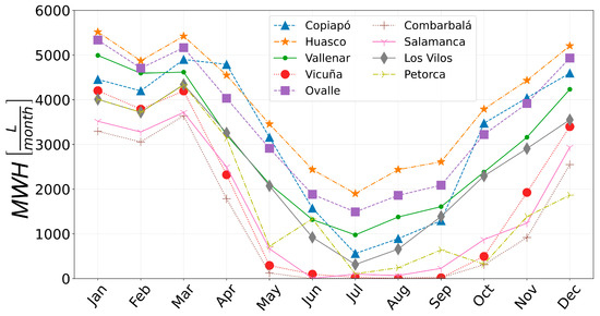 The monthly moisture harvesting index (), proposed by Gido et al. [26], is used to assess the feasibility and the energy requirements of the atmospheric water harvesting system. It is calculated with Equation (1), with a reference air condition of 4 °C at the evaporator exhaust to avoid any problem of frosting formation. Figure 2 shows the monthly for the selected cities. The behavior of the indicator is similar for all cities, where summer and winter have the highest and lowest values, respectively. Some cities, such as Vicuña, Combarbalá, Salamanca, and Petorca, present an lower than 0.1 during winter. On the other hand, Huasco is expected to be the most suitable location for AWGs, since it presents the highest in almost all months.