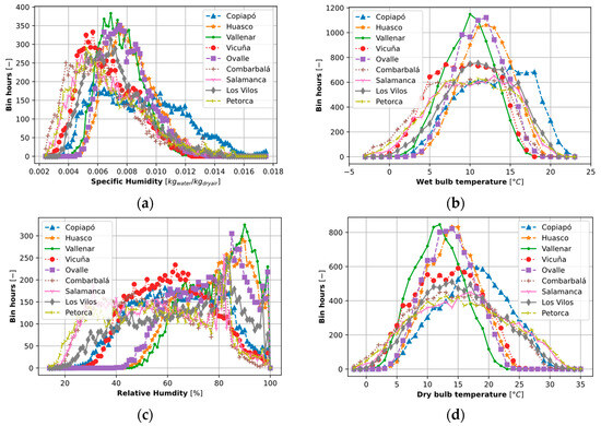 Figure 3 shows the hourly distribution of the most important properties of the atmospheric air in these cities: specific humidity, wet bulb temperature, relative humidity, and dry bulb temperature. In general, Chilean ambient temperatures are lower than the ones of other cities reported in the literature using this kind of system.