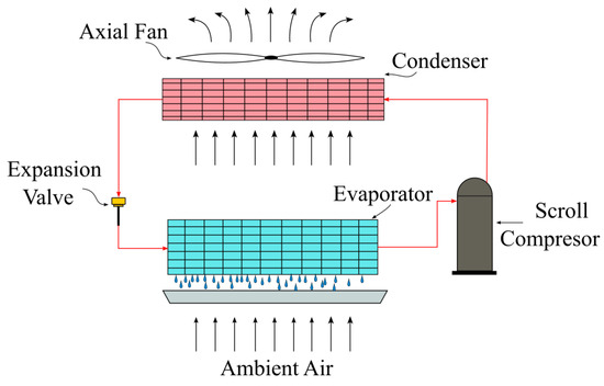 The system is designed based on a single VCR cycle that considers an evaporator, a compressor, a condenser, an expansion valve, and an axial fan. These components and the VCR system are presented in Figure 4. The evaporator is used to remove the sensible and latent load from the air, causing condensation of the atmospheric water on its surface. The air exhausting the evaporator is conducted to the condenser, where it is heated, and finally it is discharged to the ambient through an axial fan. The system is designed to collect around 150 L/day at the following ambient average conditions: dry bulb temperature of 20 °C, relative humidity of 60%, and atmospheric pressure of 1 atm. This condition was selected as a good compromise for the system size and because it is the average meteorological condition of the Chilean northern cities during the months when the system can operate more efficiently (higher water collection).