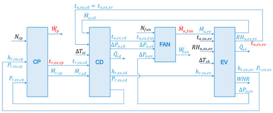 Principle of the system modelling (variables colored in black are inputs of the model, colored in red are variables that must be checked to ensure safe working conditions, while the rest are determined by the mathematical model). CP represents the compressor model, CD the condenser model, FAN the axial fan model, and EV the evaporator model, respectively.
