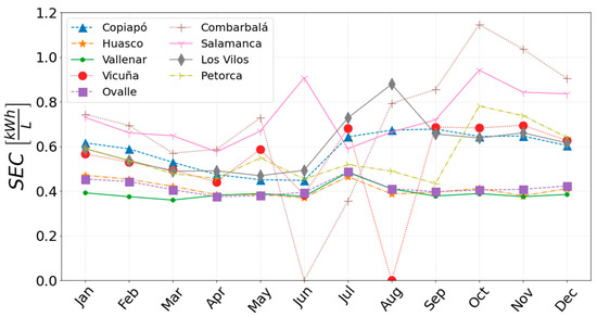 Concerning the SEC, it varies between 0.355 and 1.146 kWh/L, with Vallenar, Ovalle, and Huasco presenting the lowest values, and thus the most favorable conditions for this technology. On the other hand, Combarbalá presents the highest SEC and, therefore, it is the most unfavorable city for this technology.