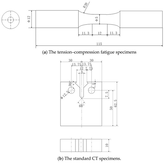The dimensions of specimens: (a) The dimensions of the tension-compression fatigue specimens; (b) The dimensions of the standard CT specimens.