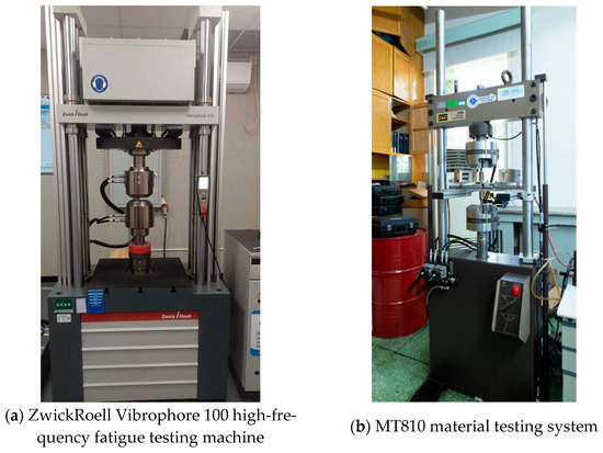 Test apparatus: (a) ZwickRoell Vibrophore 100 high-frequency fatigue testing machine; (b) MT810 material testing system.
