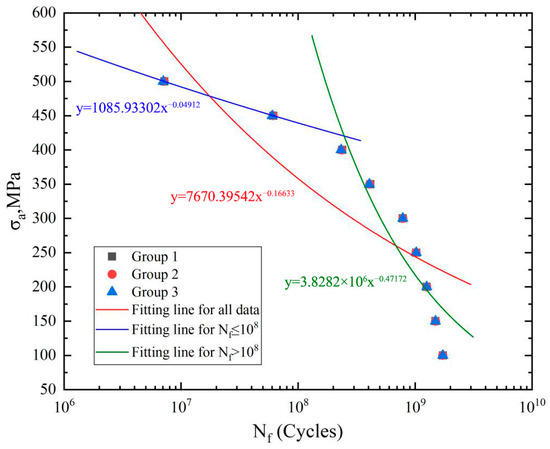 A significant scatter was noted in the curve fitting of the complete VHCF S-N data to establish the power law relationship (Figure 3). Utilizing a piecewise function may offer a more precise depiction of the VHCF life behavior, as illustrated in Equation (2).