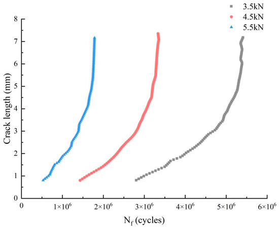 Figure 4 illustrates the relationship between fatigue crack lengths and the number of cycles for applied forces of 3.5 kN, 4.5 kN, and 5.5 kN (All data in the figure were obtained directly from the testing machine’s measurement system). In accordance with ISO 12108-2018 guidelines, the stress-intensity factor K can be determined by utilizing the applied forces and the corresponding crack lengths derived from fatigue crack growth tests using Equation (3):