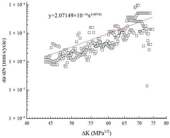 Figure 5 illustrates the correlation between fatigue crack growth rates () and stress intensity factor ranges () on a log-log scale. A linear regression was performed on the data to determine the material constants C and m in Paris’ law, resulting in values of 2.071 × 10−16 and 6.007, respectively. Therefore, the Paris’ law equation for X17CrNi15-2 martensitic stainless steel is expressed as