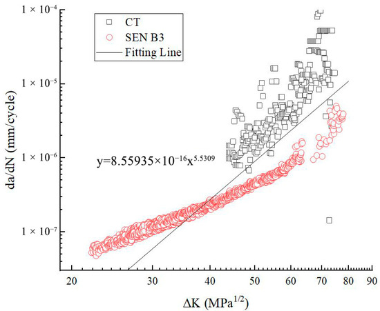 A study previously examined the impact of ceramic coating on the fatigue crack growth behavior of X17CrNi15-2 stainless steel through three-point single-edge notch bend (SEN B3) specimens at R = 0.1 [4]. The fatigue crack growth data obtained from the CT specimens were compared with those from the SEN B3 specimens in the aforementioned study [4] (Figure 6). In Figure 6, the values for SEN B3 specimens ranged from 25 to 77 , where as for CT specimens, they ranged from 43 to 75 . The test data from SEN B3 specimens were situated at the lower end of the test data from the CT specimens at . A new power law relationship between crack growth rates () and stress intensity factor ranges () was established using data from both the CT and SEN B3 tests, as represented in Equation (7):
