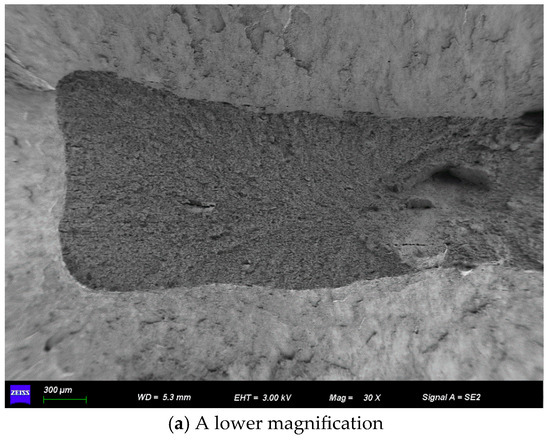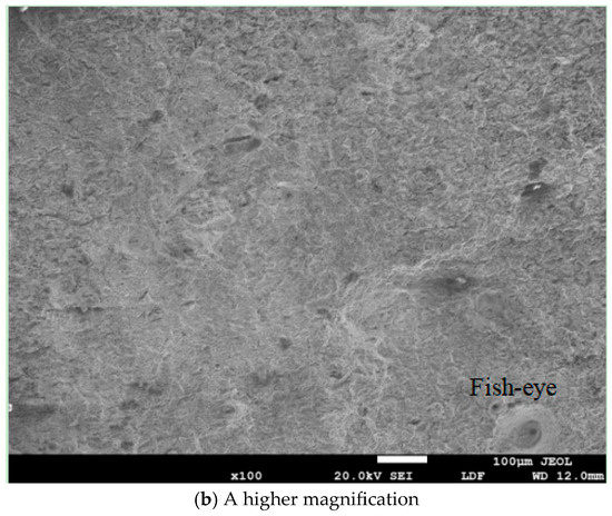 SEM images of the fracture surfaces of the tested VHCF specimen: (a) a lower magnification; (b) a higher magnification.