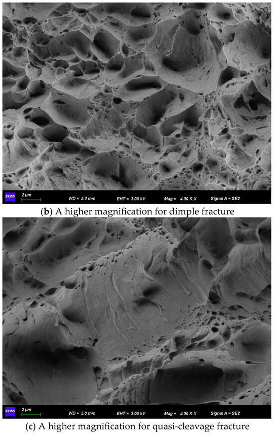 SEM images of the fracture surfaces of the tested VHCF specimen: (a) a lower magnification (b) a higher magnification for dimple fracture; (c) a higher magnification for quasi-cleavage fracture.