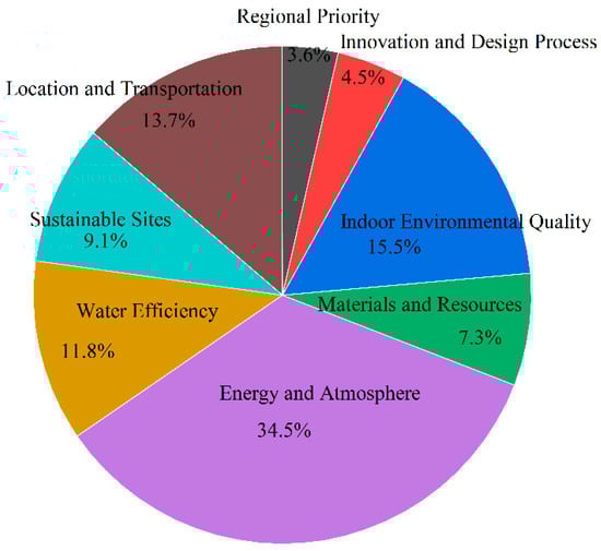 The evaluation of green data centers originated in the United States. In 1998, the U.S. Green Building Council (USGBC) released the first edition of the Leadership in Energy and Environmental Design (LEED) evaluation guidelines, which have since evolved to the fifth edition [30]. LEED certification takes buildings as the primary object of evaluation and emphasizes environmental protection and sustainable development in both the structure and its surrounding context [31]. Figure 1 presents the comprehensive building evaluation indicators and their weights as published by the USGBC in the LEED guidelines. Within this building-oriented scheme, the weights denote the relative importance of each dimension for assessing a project’s overall environmental and sustainability performance. USGBC establishes these weights based on green-building practice and expert judgment, and applies them to both existing buildings and new construction. In the context of evaluating green data centers, the relevant certifications are LEED BD + C (Building Design and Construction) and LEED O + M (Building Operations and Maintenance). This study uses LEED O + M as the exemplar for discussing the evaluation framework.