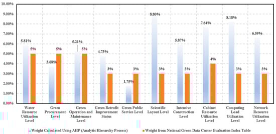 Comparison of AHP-calculated weights with national green data center evaluation indicator weights.