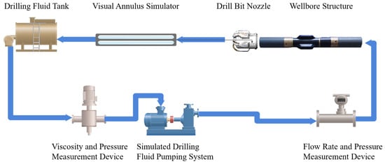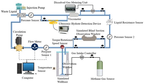Based on the hydrate formation boundaries determined in the static experiments, a dynamic hydrate formation testing system was developed to simulate drilling fluid circulation during deepwater drilling. The objectives of this system were twofold: firstly, to construct a small-scale simulation apparatus capable of reproducing the hydrate formation process within a non-target interval of a deepwater wellbore under atmospheric pressure conditions. Secondly, to utilize the apparatus within a low-temperature laboratory environment to conduct evaluation experiments on hydrate formation during simulated drilling fluid circulation. On this basis, a combined hydrate formation boundary–dynamic drilling circulation simulation system was established. The conceptual design of the system is illustrated in Figure 3.
