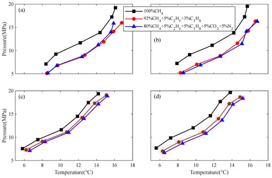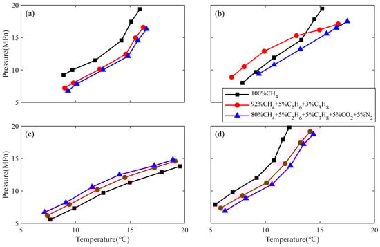 HEM drilling fluid is widely applied in the South China Sea. Using the same experimental protocol, phase equilibrium measurements were obtained for HEM under six temperature–pressure conditions with three gas compositions. As shown in Figure 5d, hydrate formation is more favorable with higher carbon content in the gas mixture, again reducing the operational safety margin. Table 4 lists the derived hydrate formation boundaries.