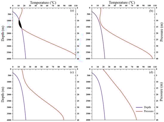 Figure 7 shows the hydrate formation regions under different circulation rates. At 300 L/min (Figure 6a), the operational pressure–temperature trajectory slightly intersects with the hydrate phase boundary, indicating a very narrow hydrate formation zone under extremely low flow conditions. However, as the circulation rate increases to 600 L/min, 1200 L/min, and 4000 L/min (Figure 6b–d), the temperature profiles remain consistently above the hydrate stability zone, and no intersection with the equilibrium boundary is observed. This suggests that during normal drilling circulation, the combination of frictional heating and efficient convective heat transfer prevents the annular temperature from entering the hydrate stability zone, thereby making hydrate formation and plugging highly unlikely.