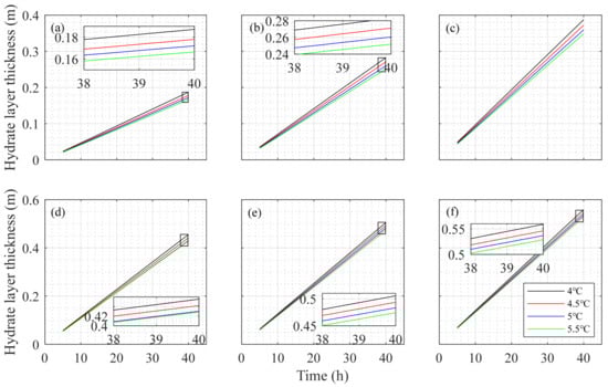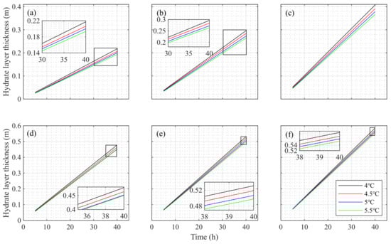 Hydrate formation thickness for seawater–bentonite slurry at water depths of (a) 1000 m, (b) 1200 m, (c) 1400 m, (d) 1600 m, (e) 1800 m, and (f) 2000 m under different temperature gradients.