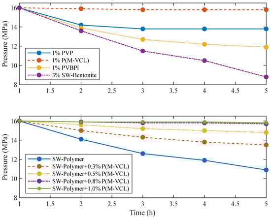 Figure 10 shows that the drilling fluid containing 1% P(M-VCL) exhibited the smallest pressure drop in the reactor, only 0.2 MPa after 20 h of reaction, indicating excellent performance in preventing hydrate formation. In addition, Figure 10 presents the time-dependent gas consumption curves for all three inhibitors, clearly showing that P(M-VCL) significantly delayed hydrate nucleation compared to PVP and PVBPI, further validating its superior inhibition capacity.