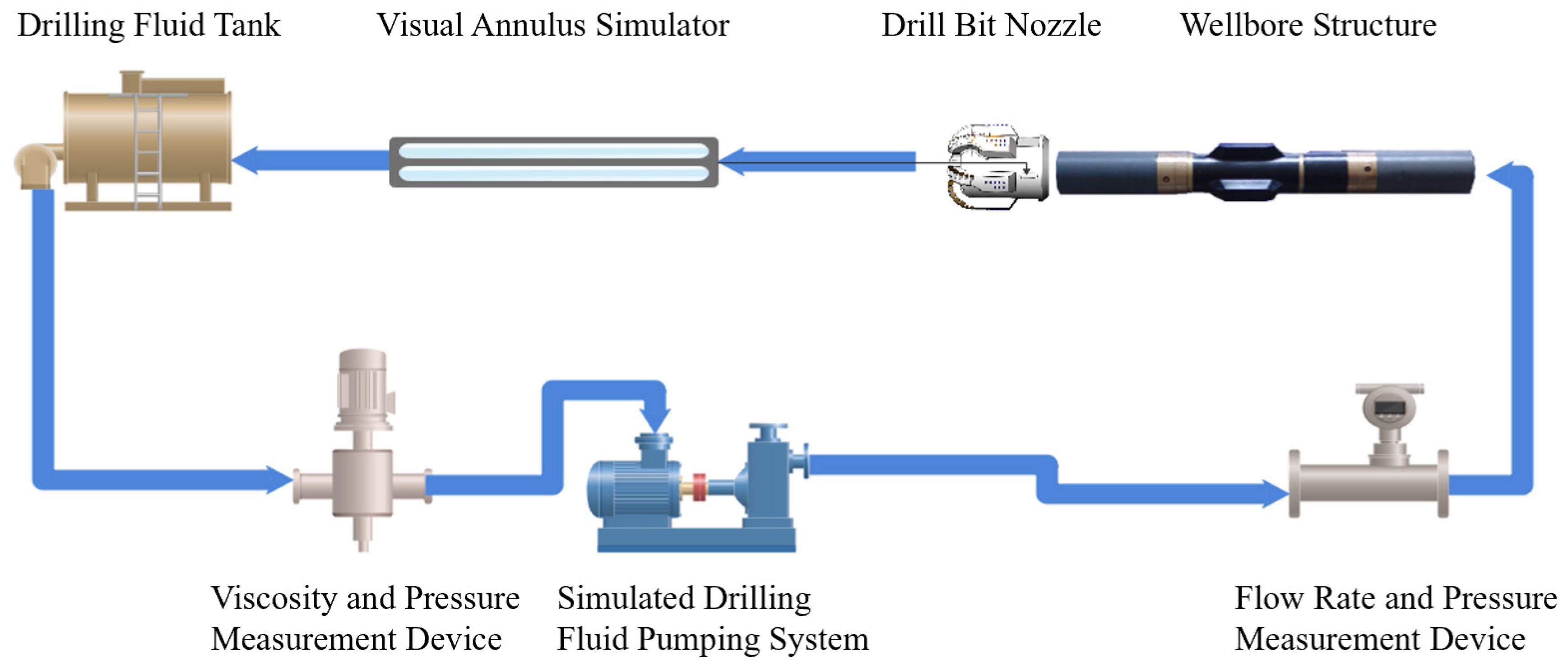 Based on the hydrate formation boundaries determined in the static experiments, a dynamic hydrate formation testing system was developed to simulate drilling fluid circulation during deepwater drilling. The objectives of this system were twofold: firstly, to construct a small-scale simulation apparatus capable of reproducing the hydrate formation process within a non-target interval of a deepwater wellbore under atmospheric pressure conditions. Secondly, to utilize the apparatus within a low-temperature laboratory environment to conduct evaluation experiments on hydrate formation during simulated drilling fluid circulation. On this basis, a combined hydrate formation boundary–dynamic drilling circulation simulation system was established. The conceptual design of the system is illustrated in