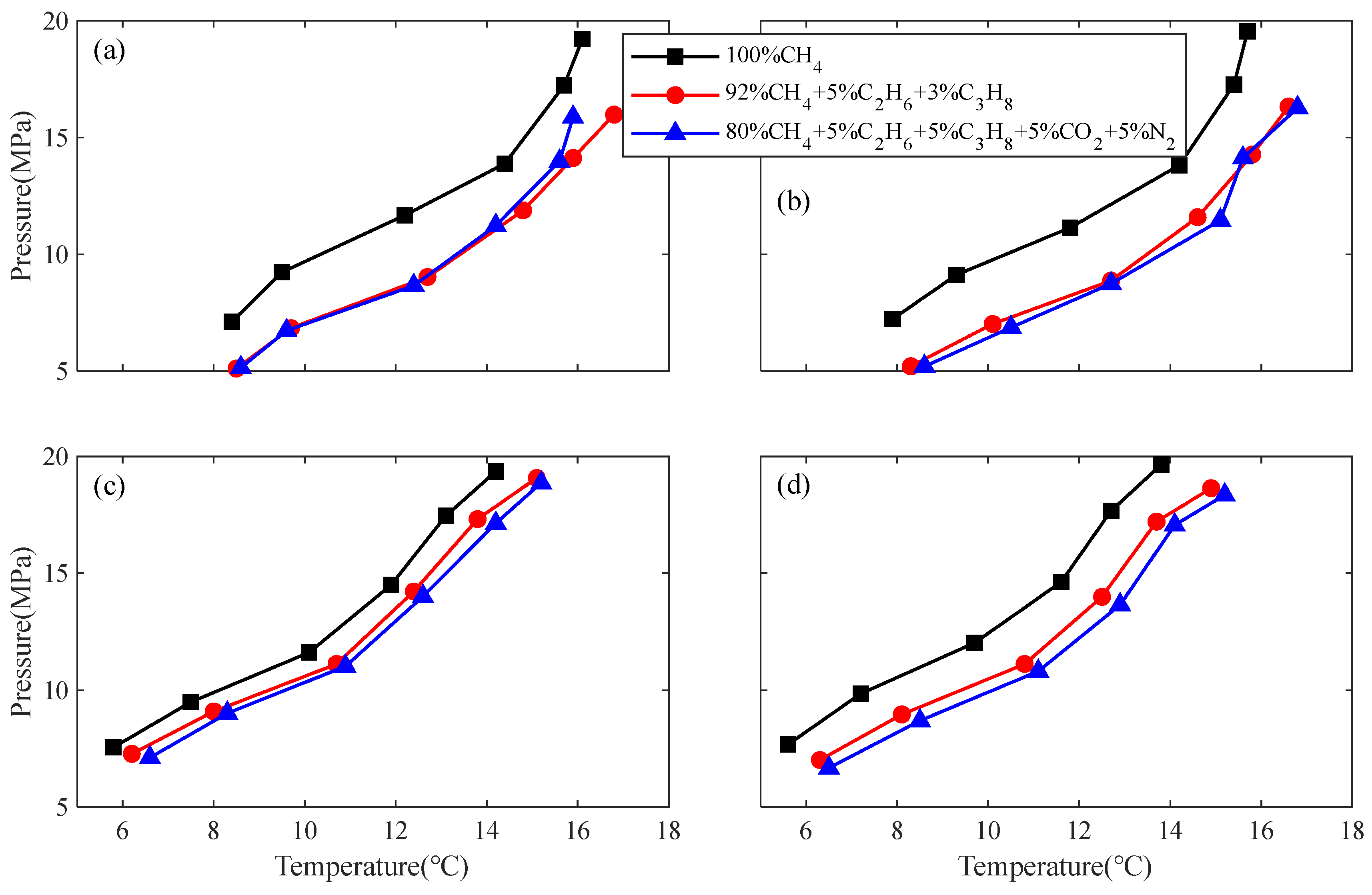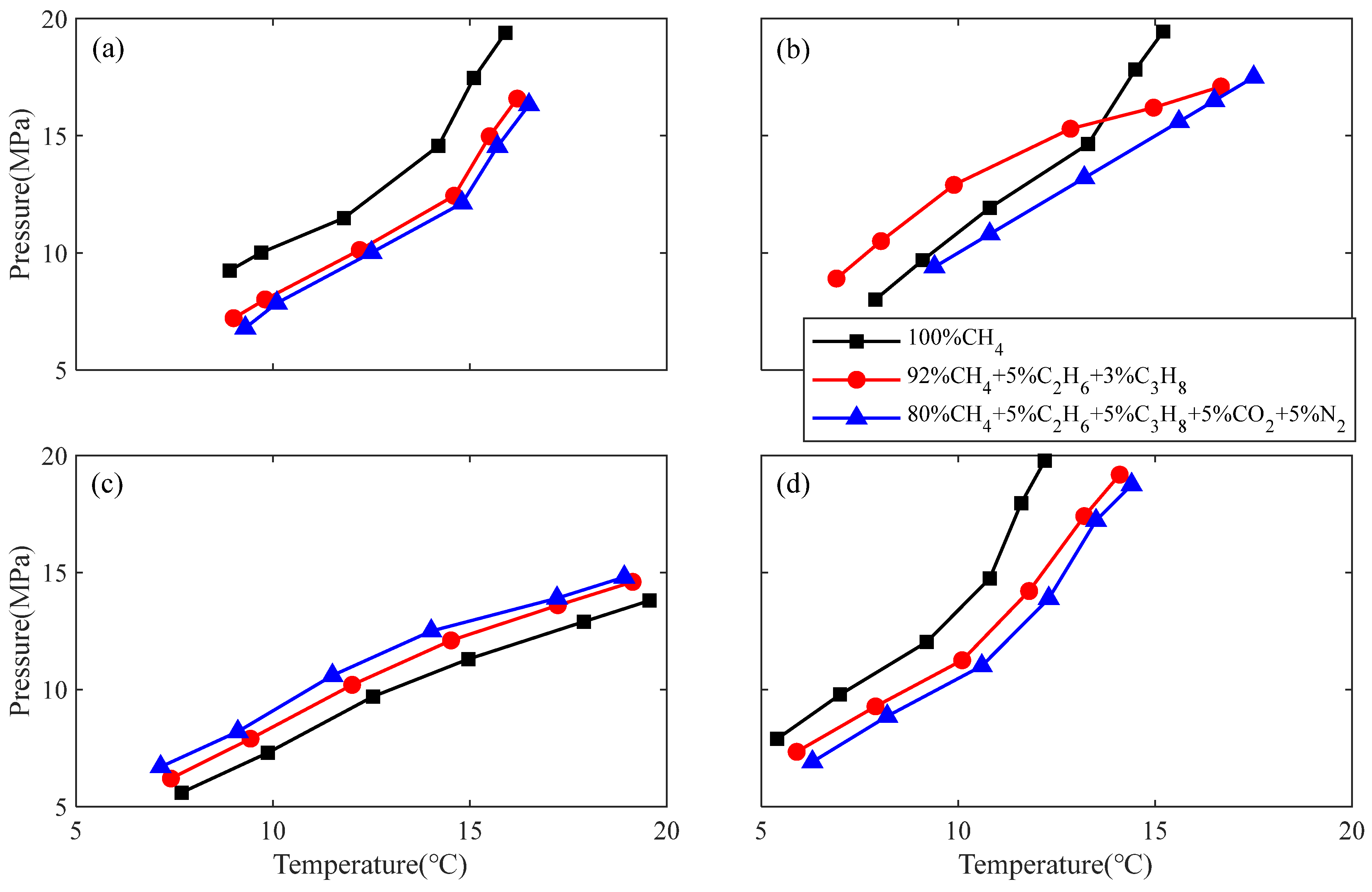 Figure 6c). The results again indicate that gas mixtures with higher carbon content result in more favorable hydrate formation conditions, constraining the safe temperature–pressure range.