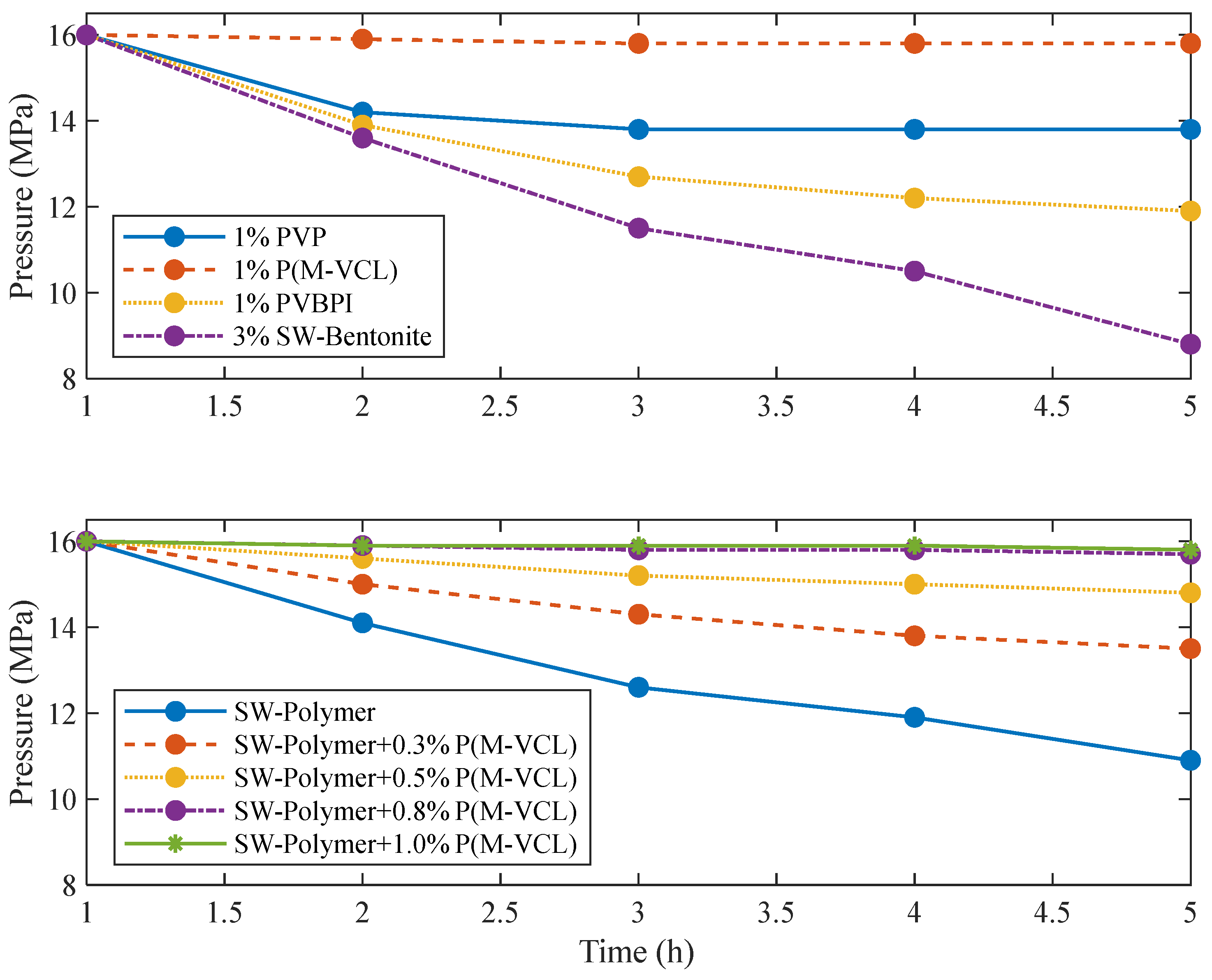 Figure 10 shows that the drilling fluid containing 1% P(M-VCL) exhibited the smallest pressure drop in the reactor, only 0.2 MPa after 20 h of reaction, indicating excellent performance in preventing hydrate formation. In addition,