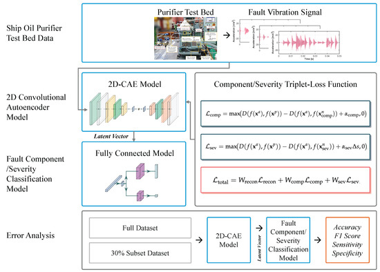 Metric learning, notably triplet-loss, further structures the latent space and helps in limited-data settings. Triplet-loss optimizes the latent vector such that anchor–positive pairs (from the same class) are closer than anchor–negative pairs (from different classes), thereby enhancing intra-class cohesion and inter-class separability, even under a limited-data environment [16]. However, the canonical formulation remains class-centric: it neither imposes an ordinal structure reflecting fault-severity progression nor acknowledges functional distinctions between faults arising in disparate machine components. Adaptive margin triplet-loss has recently been proposed to modulate the margin according to relative ratings and can improve the training stability and ranking performance [17]. Triplet-loss has also been used to guide adversarial domain adaptation for bearing fault diagnosis, where it aligns class-level distributions across domains and improves transferability [18]. Yet, to fully harness these metric-learning advancements within an MASS, diagnostic frameworks must extend beyond mere classification and explicitly represent both the severity gradations and the distinct origins of faults across ship subsystems.