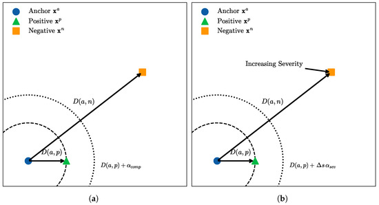 Geometric intuition underpinning the composite metric-learning objective. (a) Component-aware triplet. (b) Severity-aware triplet.