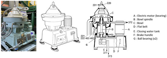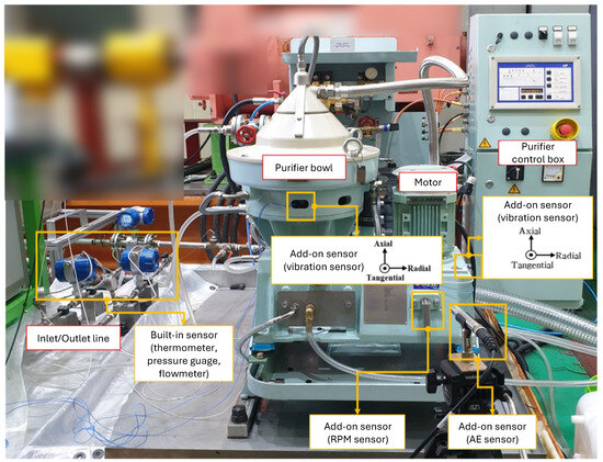 This subsection describes the protocol for building a high-fidelity vibration dataset under controlled lab conditions. Specifically, a purpose-built, land-based test bed, whose salient features are illustrated in Figure 3, houses an Alfa Laval S805 (Lund, Sweden) centrifugal oil purifier, a unit that is widely deployed across maritime platforms. A three-phase, 3600 rpm (60 Hz) electric motor actuates the purifier’s bowl assembly, which, in turn, attains 9300 rpm through a flat-belt transmission, thereby generating the requisite centrifugal field for contaminant separation. A complementary schematic of the principal subsystems is presented in Figure 4.